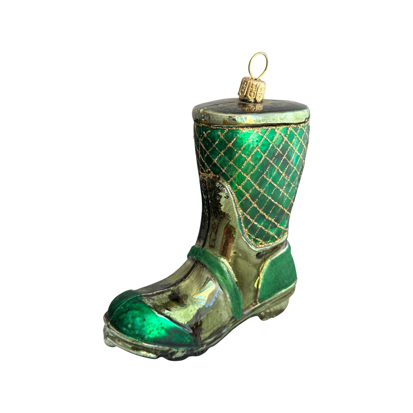 Willkommen in die Weihnachtswelt! Unser Gumistiefel Weihnachtsbaumanhänger ist mundgeblasen und handgemalt - ein einzigartiges Geschenk für Weihnachtsfreuden.